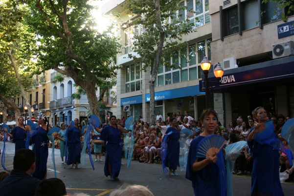 Como te contábamos el pasado año, las calles principales de Dénia se llenan de moros y cristianos desde principios hasta mediados del mes de agosto, año tras año. Siempre caen en la misma fecha. Son los participantes en las distintas embajadas, capitanías, bandos, los pasacalles y la izada de la bandera. En el programa oficial destaca el desembarco de la Reina Mora y los toques de diana, así como sobre todo, el Desfile de Gala (siempre el 15 de agosto), donde las filaes (entidades festeras o comparsas) de Moros y Cristianos lucen sus lujosos trajes al son de las diferentes bandas de música y con un paso festero y acompasado, casi marcial. Las bandas de música con sus compases son elemento esencial en el desfile, porque a pesar de la vistosidad de las diferentes representaciones, sin la música que les acompaña serían como escenas mudas... perderían parte del encanto.